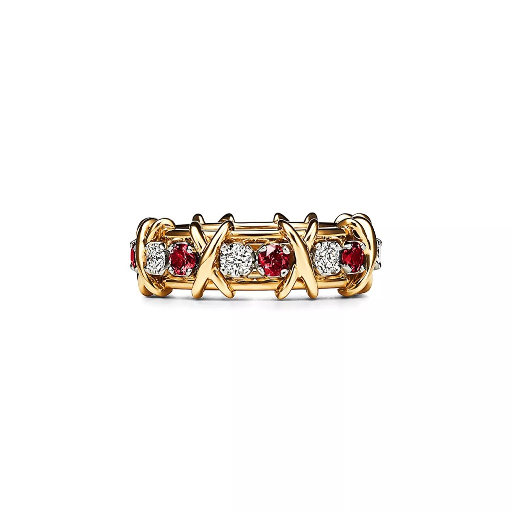 Jean Schlumberger by Tiffany Sixteen Stone is an expression of love’s nurturing forces. Conceived by legendary designer Jean Schlumberger in 1959, the collection’s cross-stitch motif was inspired by his family’s roots in textiles. This ring features intricately crafted round brilliant diamonds and rubies that alternate with graphic Xs.