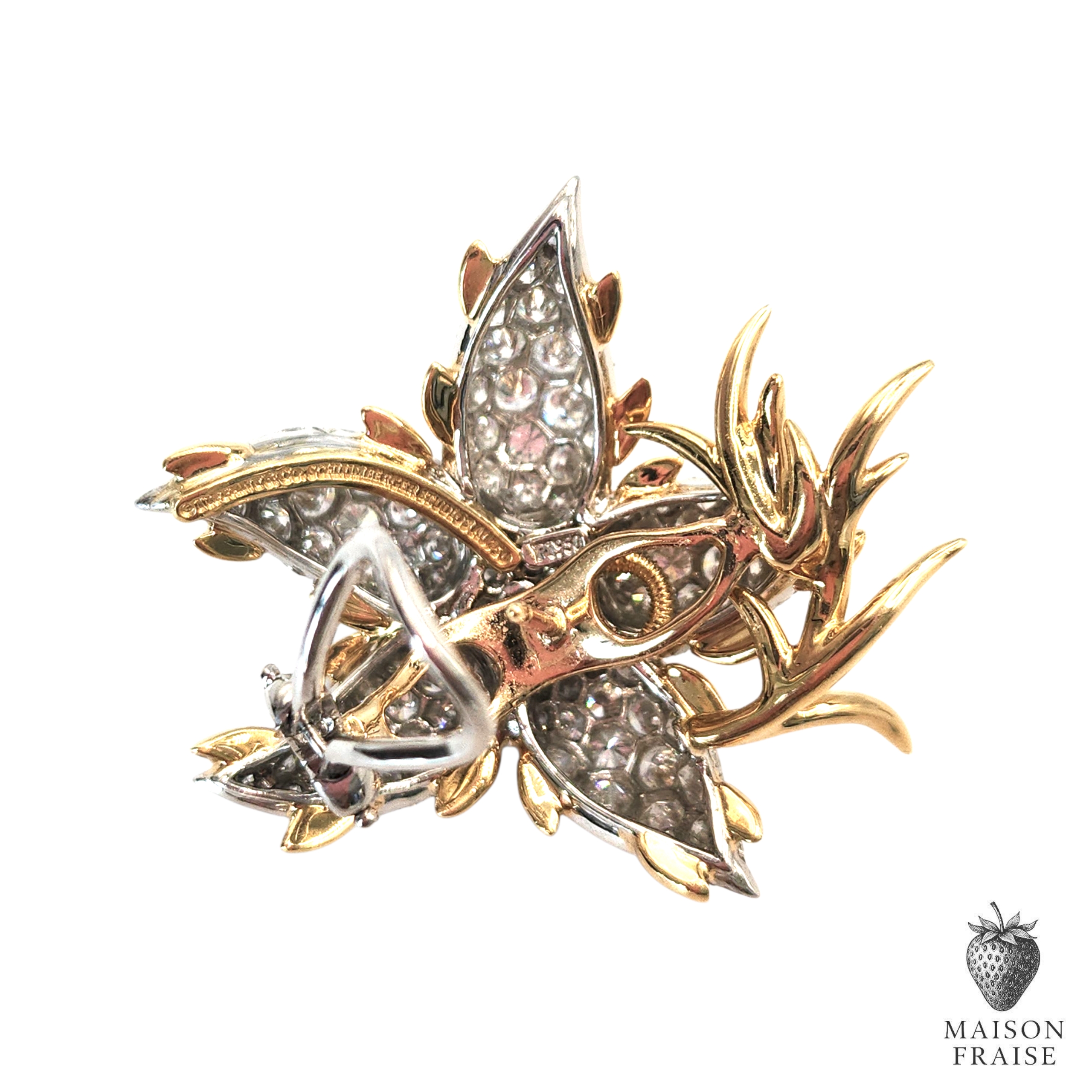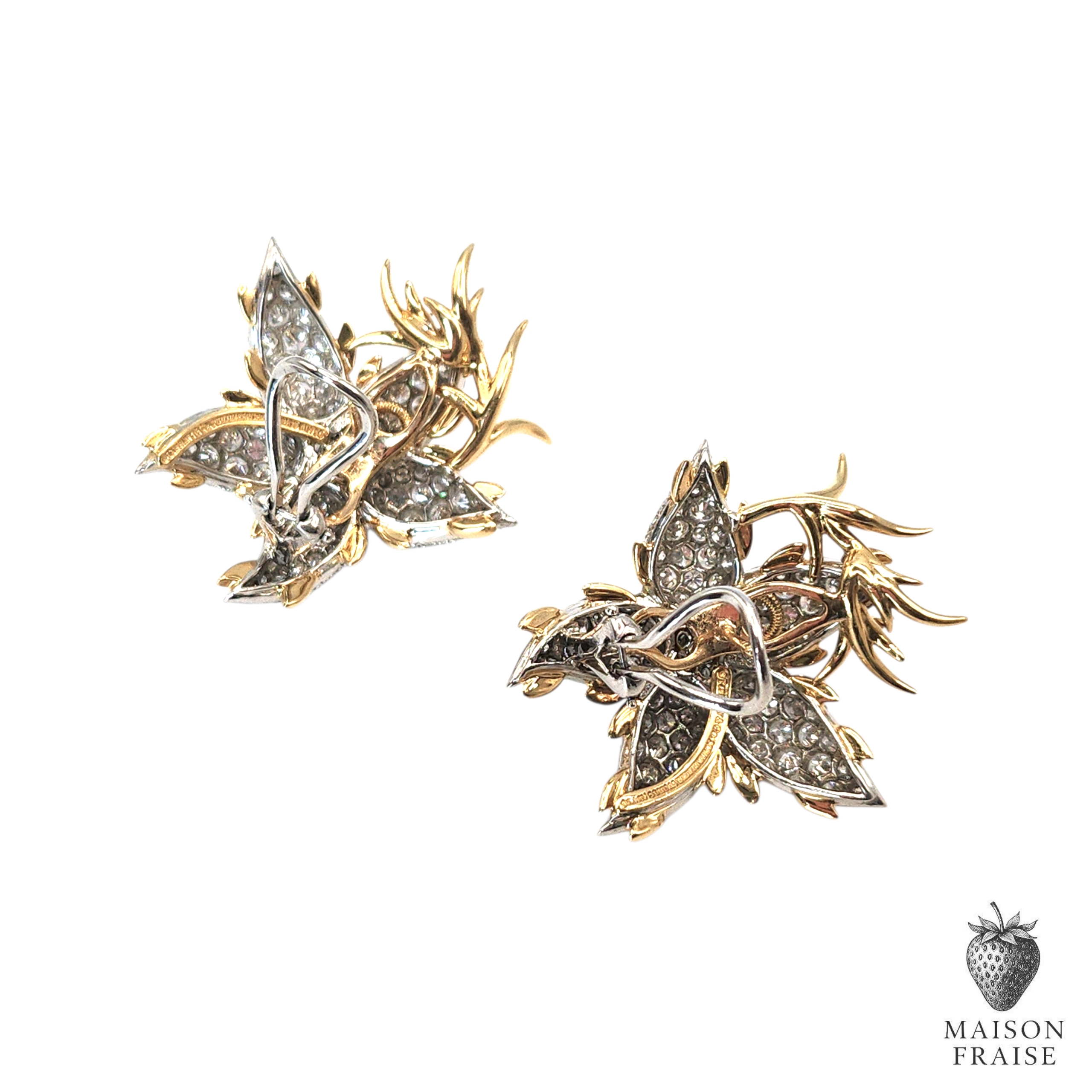 Crafted in 18k yellow gold and platinum, each earring sparkles with pavé-set diamonds, arranged in curved petals that feel full of life and movement. The top section, with its curling gold elements, evokes vines caught mid-movement — graceful, sculptural, and full of life. At the center, a small ‘fialment’ of diamonds gently shifts as you wear them, adding a playful and enchanting detail. Designed with both beauty and comfort in mind, they are fitted with post and hinge back closures for a secure and elegant fit.
